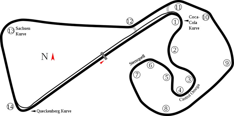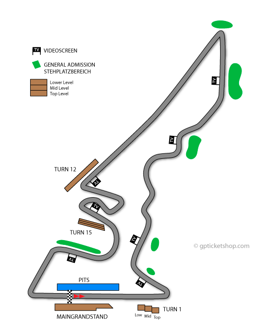 Трек кажется коротким, потому что пелетон проходит его за 1 минуту 25 секунд. Зрителям не приходится скучать долгое время: каждую минуту перед ними разыгрывает гоночное шоу - зрелищное и стремительное. Любые места на трибунах обеспечивают отличный обзор в своих секторах. Наиболее зрелищные - Sachsen Kurve и Stemquell, но толпы всегда собираются перед первым поворотом - Coca-Cola Kurve. Смотреть за невероятными перекладками в связках на спуске с холма можно и в Castrol Omega.