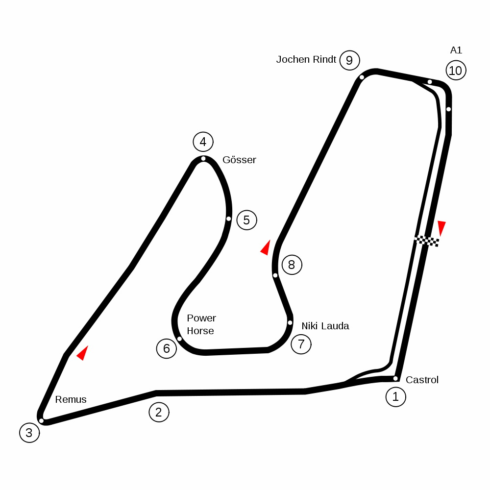 Трассу строил Герман Тильке, и поэтому она до боли напоминает нынешний вид автодрома Red Bull Ring, но с большим разнообразием поворотов. Всего их 12, преимущественно правосторонние.